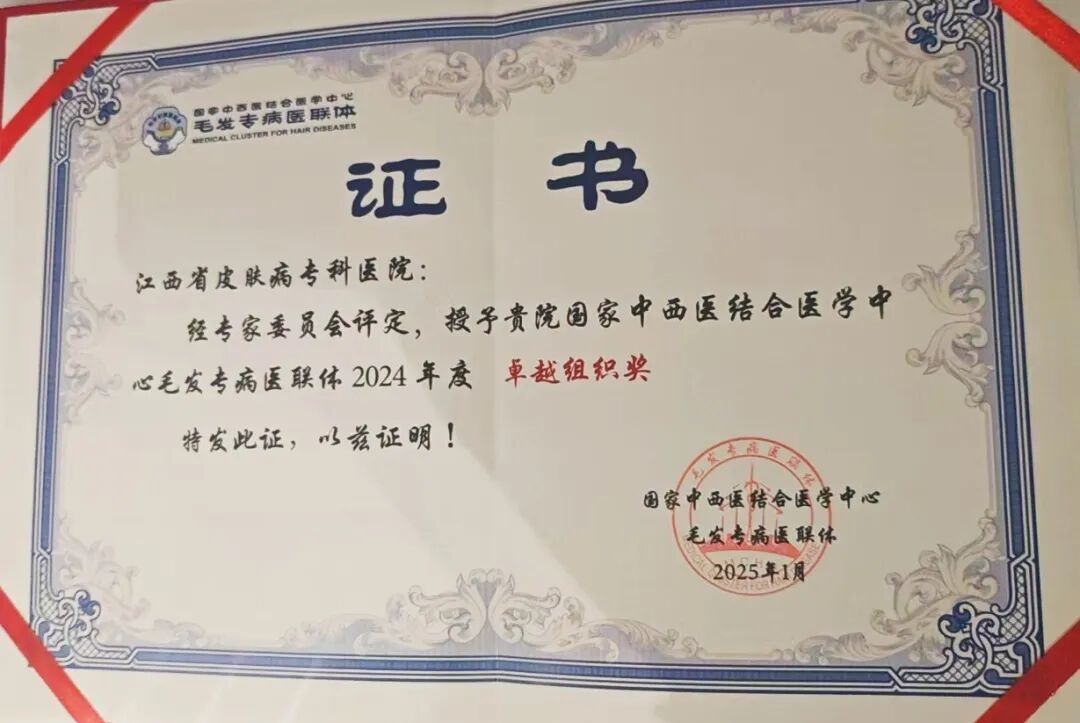 近日在北京召开的“第七届国家中西医结合医学中心毛发专病医联体年会暨管理论坛”上江西省皮肤病专科医院荣获“2024年度卓越组织奖”。